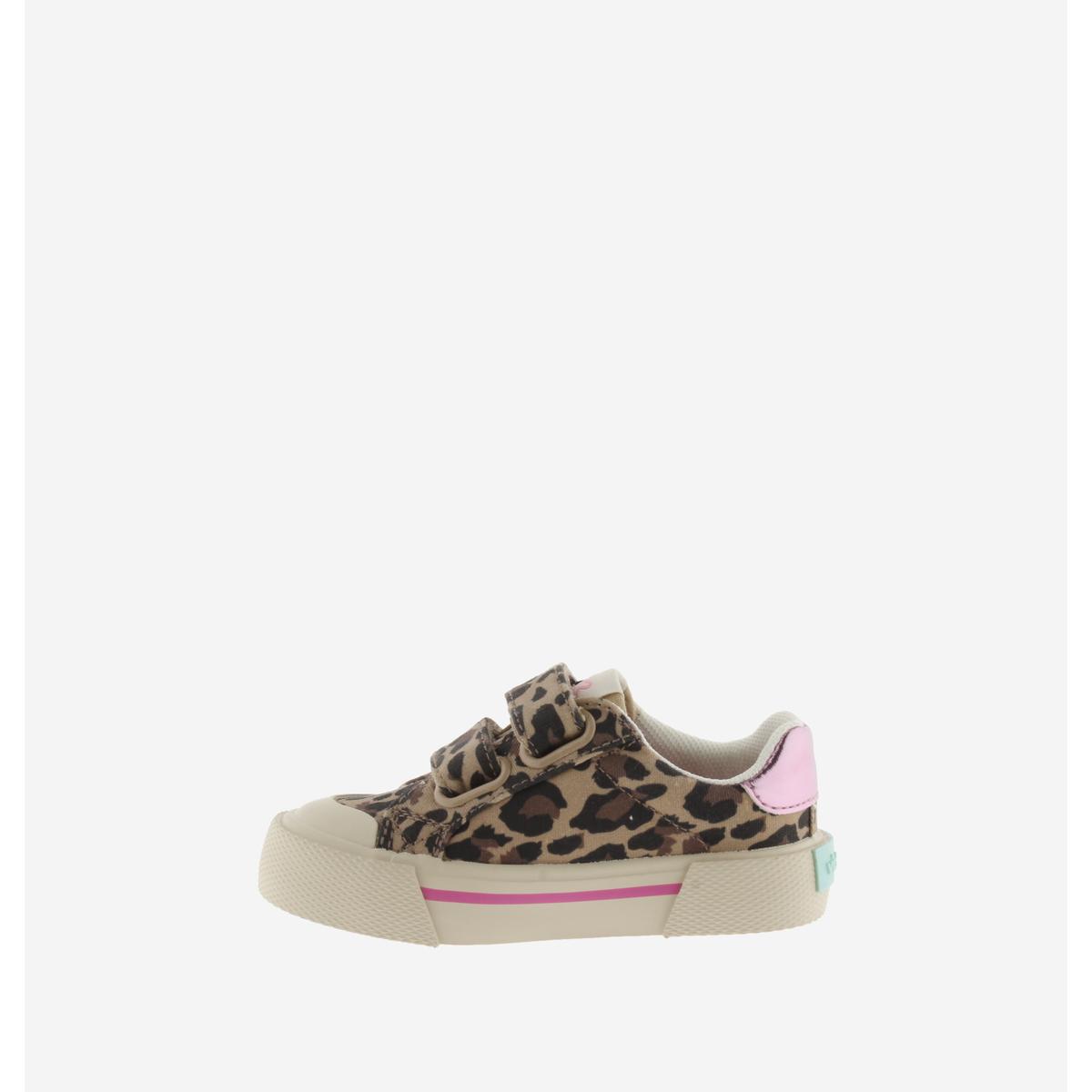 Low-top canvas trainers with a camouflage print (khaki) and animal pattern (leopard). They fasten with two Velcro straps for easy on and better autonomy. Their rubber sole, slightly textured, is also reinforced at the toe for better resistance and durability. They also feature the side logo Victoria and a metallic-toned back piece (leopard).
