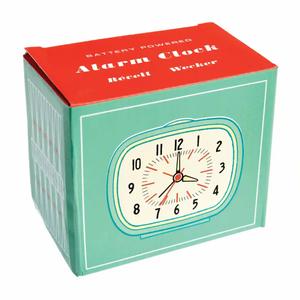 Retro blue alarm clock glows at night. Requires one AA battery, not included.