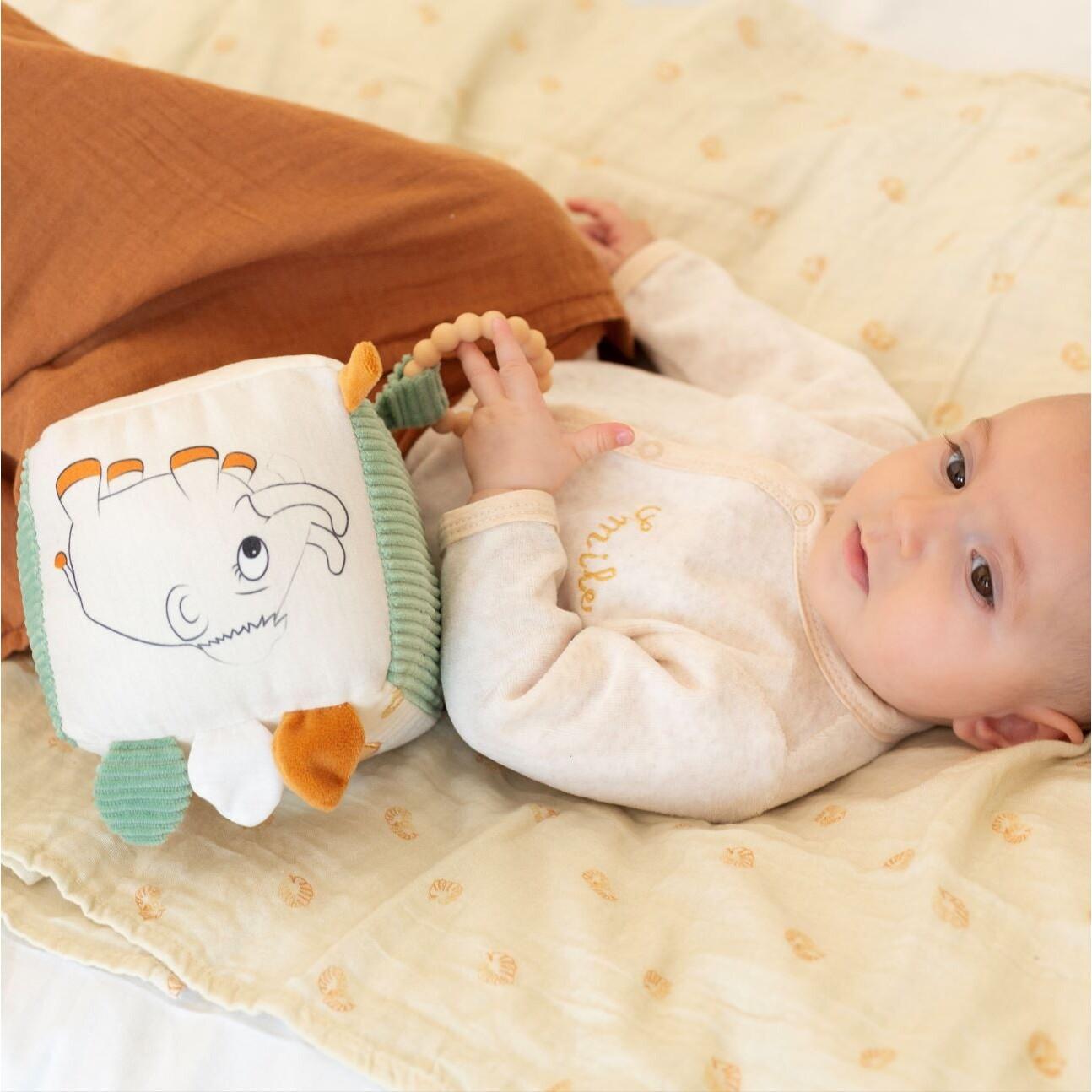 Stimulate your baby's sensory awareness and fine motor skills with the playful and educational activity cube Trois Kilos Sept Diplododo.